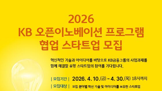 KB금융그룹(회장 양종희)이 오는 30일까지 혁신 기술·아이디어를 보유한 스타트업과 그룹 주요 계열사가 함께 새로운 사업 기회를 만들어가는 ‘2026 KB 오픈이노베이션 프로그램’ 참여 기업을 모집한다. ‘KB 오픈이노베이션 프로그램’은 유망 스타트업과 KB금융 주요 계열사의 협업을 통해 금융·비금융 분야의 다양한 공동 사업 과제를 해결함으로써, 혁신 창업 생태계의 성장을 지원하고 금융과 스타트업의 동반성장을 도모하는 스타트업