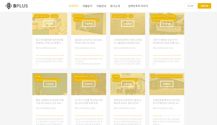 상환 기간은 60개월. 누구도 주목하지 않을 때, 여러 사회적기업이 힘을 보탰다. 동구밭, 아름다운커피, 닥터노아, 모어댄 등 12개 기업에서 자사 제품을 투자자 리워드로 내놓았다. 그렇게 50만원 이상 투자자에게 동료 기업가의 십시일반으로 마련된 리워드 패키지(시가 26만9900원 상당)가 전달됐고, 목표액을 달성했다. 박기범(40) 비플러스 대표는 “이익 극대화를 목표로 하는 전통적 투자 관점으로는 절대 진행할 수 없는 펀딩인데, 사회적기업들의 연대와 자선에 가까운 개인들의 투자로 가능했다”며 “특히 투자자들이 투자를 결정하는 데 단순히 수익률만을 바라보지 않는다는 걸 확인할 수 있었던 계기”라고 말했다.