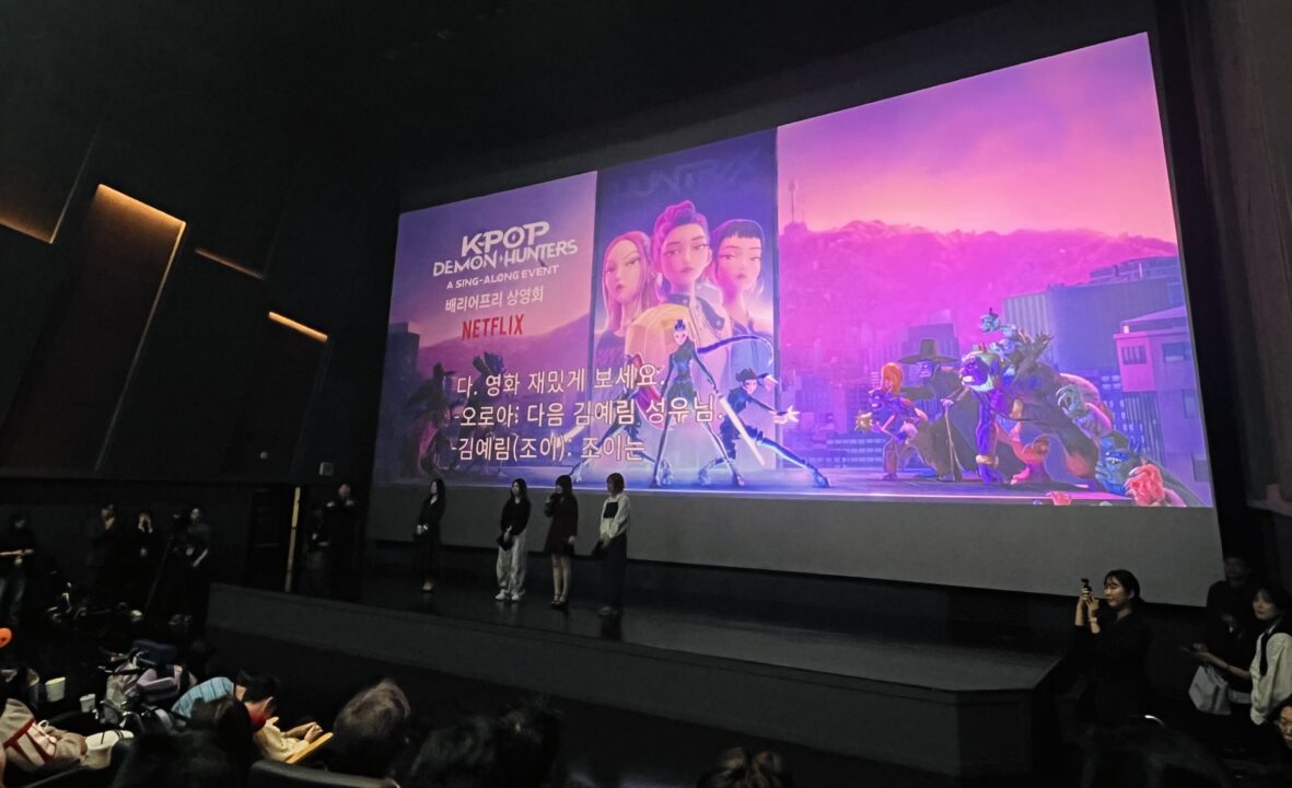 지난 1일 롯데시네마 건대입구점에서 열린 넷플릭스 배리어프리 상영회에서 ‘케이팝 데몬 헌터스’의 화면해설 성우와 헌트릭스의 한국어 더빙 성우진들이 오프닝 무대에 올랐다. /김지영 인턴기자
