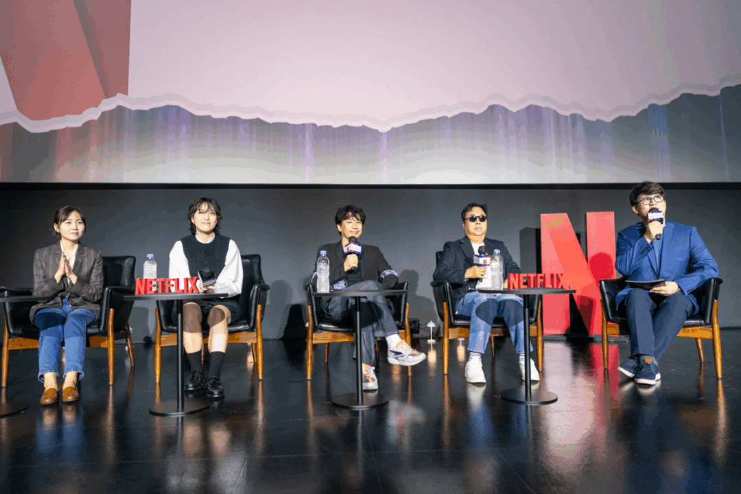 왼쪽부터 루시 황 넷플릭스 더빙 타이틀 매니저, 최수연 넷플릭스 시니어 로컬라이제이션 프로듀서, 코미디언 김경식, 코미디언 이동우, 조현준 넷플릭스 커뮤니케이션 디렉터가 지난 1일 오후 롯데시네마 건대입구점에서 열린 ‘넷플릭스 배리어프리 미디어데이’에서 패널 토론을 이어가고 있다. /넷플릭스