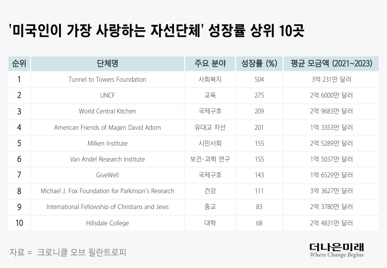 2018~2020년 평균 기부금 대비 2021~2023년 평균 기부금 증가폭이 가장 컸던 10개 단체는 ▲터널 투 타워스(504%) ▲UNCF(275%) ▲월드 센트럴 키친(209%) ▲마겐 다비드 아돔 미국 후원회(201%) ▲밀컨 연구소(155%) ▲반 안델 연구소(155%) ▲기브웰(143%) ▲마이클 제이 폭스 파킨슨병 연구재단(111%) ▲국제 기독교·유대인 협력기금(83%) ▲힐즈데일 대학(68%)이다.