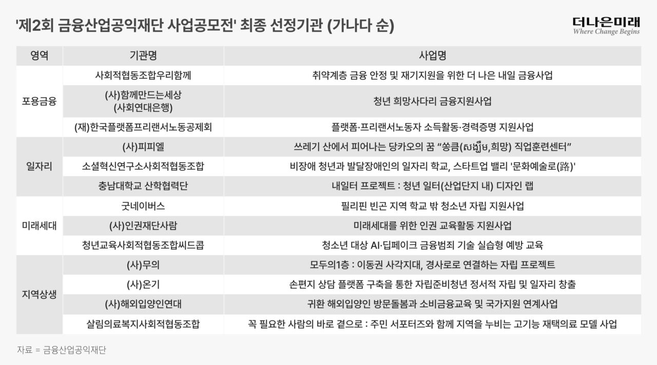 금융산업공익재단(이사장 주완)이 ‘제2회 사업공모전’ 결과 총 13개 신규 사업을 최종 선정했다고 27일 밝혔다. 올해 공모전은 ‘지속가능한 사회, 따뜻한 금융이 함께’를 주제로 포용금융, 일자리, 미래세대, 지역상생 등 4대 영역에서 사회적 임팩트를 창출할 사업을 발굴하기 위해 진행됐다.