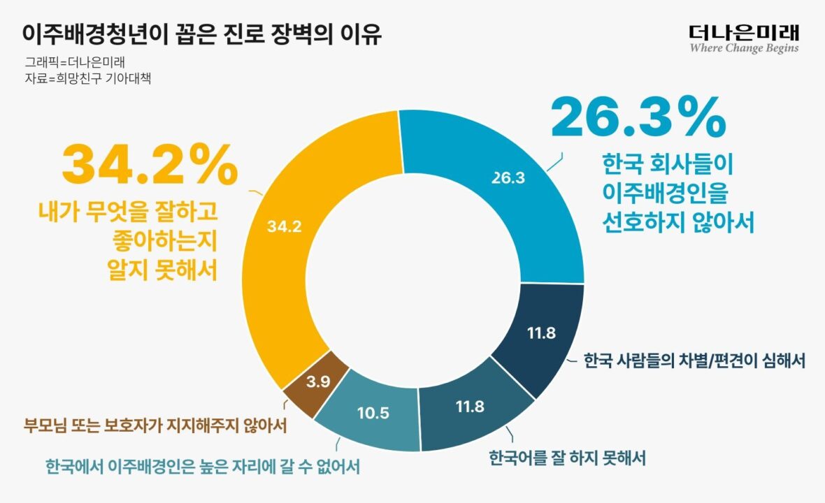 지난달 희망친구 기아대책이 발표한 ‘이주배경아동 이슈리포트’에 따르면, “또래만큼 꿈을 위해 노력할 수 있다고 생각하느냐”는 물음에 응답자의 34%가 “그렇지 않다”고 답했다. 이유로는 ‘내가 무엇을 잘하고 좋아하는지 알지 못해서’(34%)가 가장 많았다. 이어 ‘한국 회사들이 이주배경인을 선호하지 않아서’(26%), ‘한국 사람들의 차별·편견이 심해서’(12%) 순이었다.