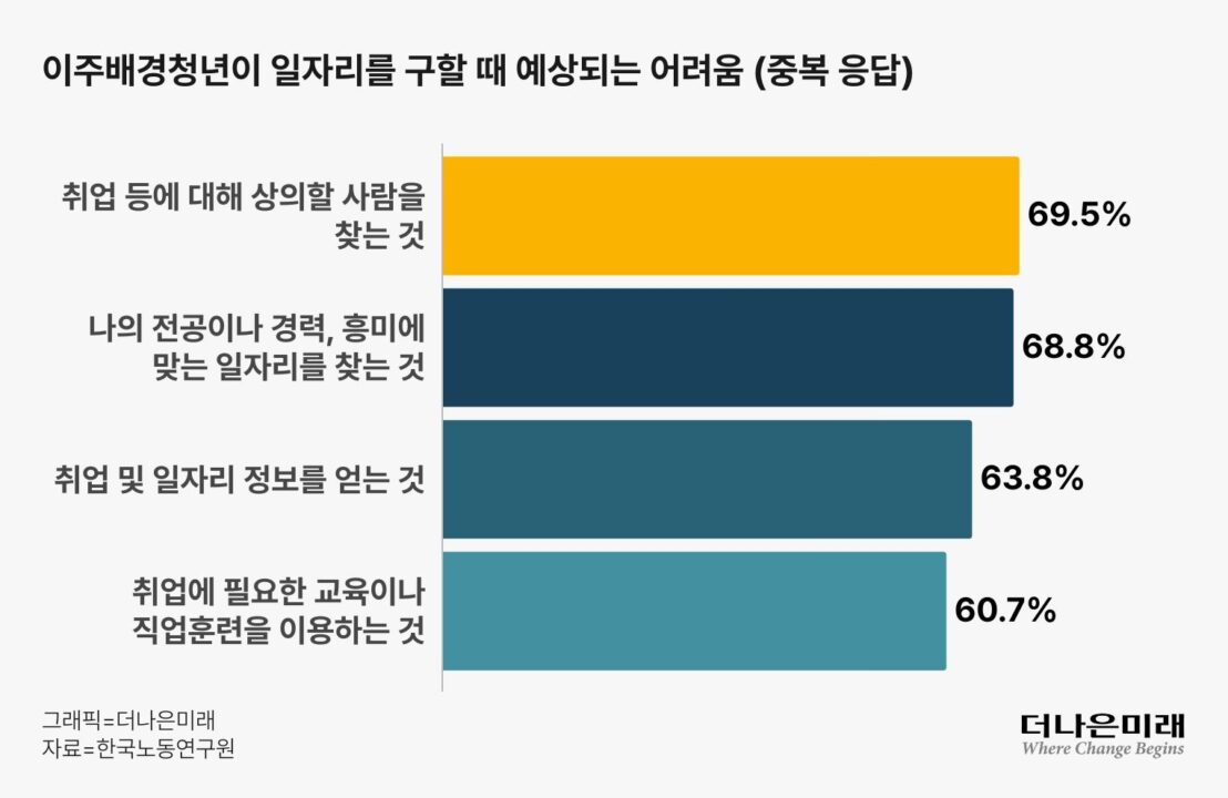 한국노동연구원의 ‘이주배경 청년의 노동 시장 이행 연구(2024)’에 따르면, ‘일자리를 구할 때 예상되는 어려움’으로 가장 많이 꼽힌 항목은 ‘취업 등에 대해 상의할 사람을 찾는 것(69.5%)’이었다. 이어 ‘나의 전공이나 경력, 흥미에 맞는 일자리를 찾는 것(68.8%)’, ‘취업 및 일자리 정보를 얻는 것(63.8%)’, ‘취업에 필요한 교육이나 직업훈련을 이용하는 것(60.7%)’ 순이었다.
