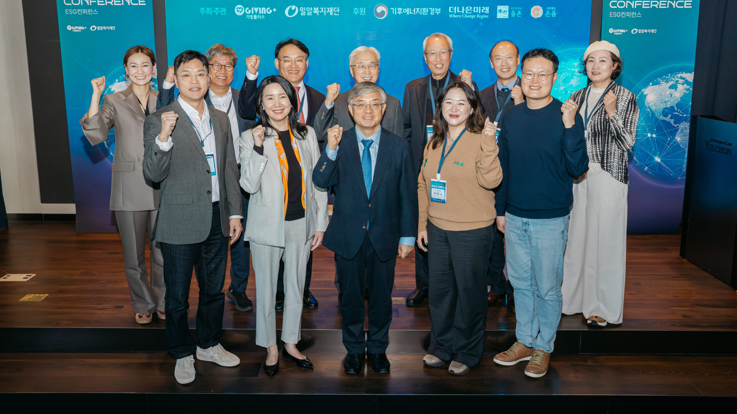 12일 기빙플러스와 밀알복지재단이 개최한 ‘2025 ESG 컨퍼런스’에서 참가자들이 기념사진을 찍고 있다. 이번 컨퍼런스는 ‘기상이변(Climate Disruption) 시대, 1.5℃의 전환점: 2026 지속가능한 ESG 전략’을 주제로 진행됐다. /기빙플러스