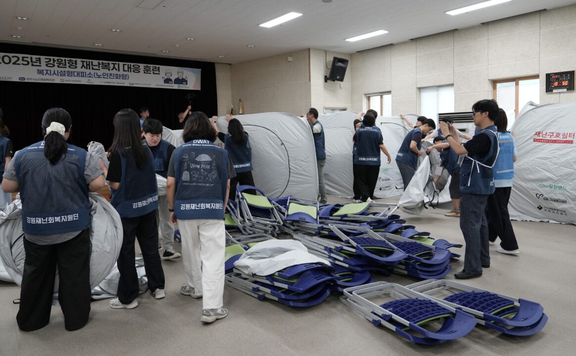 사업은 교육을 통해 재난복지 전문인력 DWAT(Disaster Welfare Assistance Team)을 양성한 뒤 실전훈련을 진행하는 방식으로 이뤄졌다. 입문 교육을 통해 68명의 재난복지 전문인력이 양성됐고, 8월 한 달간 강원 지역에서 세 차례 실전훈련이 이어졌다. 13일 원주시노인종합복지관에서는 ‘노인친화형 복지시설형 대피소 훈련’, 20일 강릉 한국여성수련원에서는 장애인이 직접 참여한 ‘장애인친화형 복지대피소 훈련’, 28일 강릉 옥계면에서는 천남리 주민을 대상으로 한 ‘지역사회조사 실습’이 진행됐다.