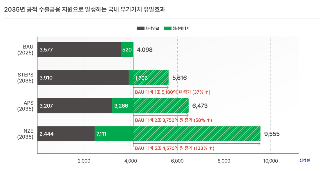 보고서는 국제에너지기구(IEA)의 1.5℃ 시나리오(NZE)를 적용해 2035년까지 공적 금융 포트폴리오를 청정에너지 중심으로 전환할 경우 국내 일자리가 현행 5만1000개에서 최대 11만개로 늘어난다고 분석했다. 총 금융 규모를 확대하지 않고 현 구조를 유지할 경우 증가폭은 5만1000개에 그친다.