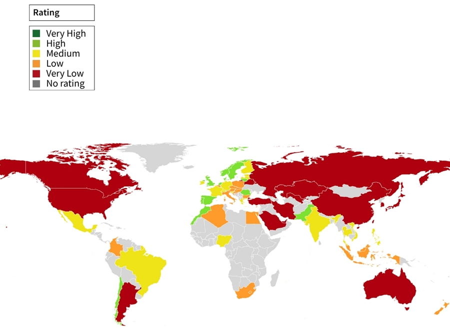 54위에 오른 중국은 전기차, 배터리, 재생에너지 등 녹색 기술에서 선도적이면서 비교적 야심찬 기후목표를 세웠지만, 동시에 화석연료 생산을 확대하는 세계 최대 온실가스 배출국이기도 하다. 미국은 눈에 띄는 하락세를 보이며 전체 순위에서 러시아(64위)보다 낮은 65위까지 떨어졌다.