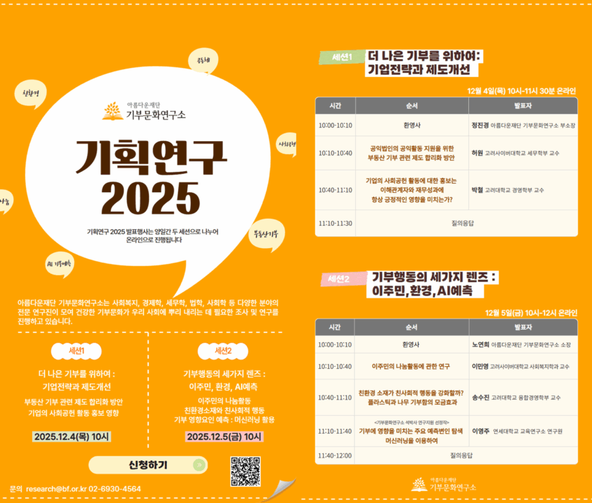 아름다운재단 기부문화연구소가 오는 12월 4~5일 온라인에서 ‘2025 기획연구 발표회’를 연다. 매년 한국사회 기부문화의 변화를 분석해온 기부문화연구소는 올해도 비영리 생태계를 둘러싼 주요 연구 성과를 공개하며 제도 개선 방향을 짚는다. 이번 발표회는 ‘더 나은 기부를 위한 기업 전략과 제도개선’, ‘기부행동의 세 가지 렌즈: 이주민·환경·AI예측’ 등 두 개 세션으로 구성됐다.