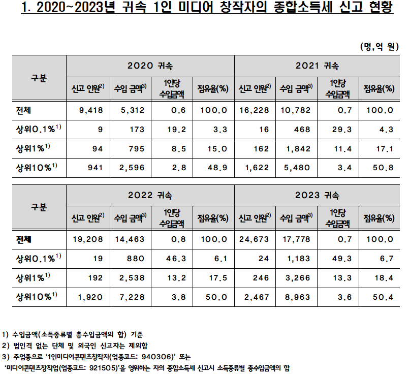 국회 기획재정위원회 소속 차규근 조국혁신당 의원이 국세청으로부터 제출받은 자료에 따르면, 2023년 기준 1인 미디어 창작자 상위 0.1%의 1인당 평균 수입은 49.3억 원으로 집계됐다. 2020년 19.2억 원이던 수입이 3년 사이 2.5배 넘게 증가했다. 같은 기간 신고 인원도 9명에서 24명으로 약 2.7배 늘었다.