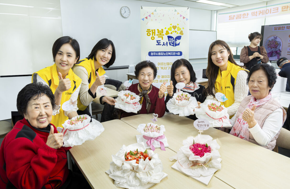 오비맥주가 청주시종합노인복지관에 어르신들을 위한 ‘행복도서관’ 12호점을 개관했다고 21일 밝혔다. 사진은 지난 20일 청주시노인종합복지관에서 오비맥주 직원들이 어르신들을 위한 앙금떡케이크 만들기 체험을 진행하며 기념 사진을 찍는 모습. /오비맥주