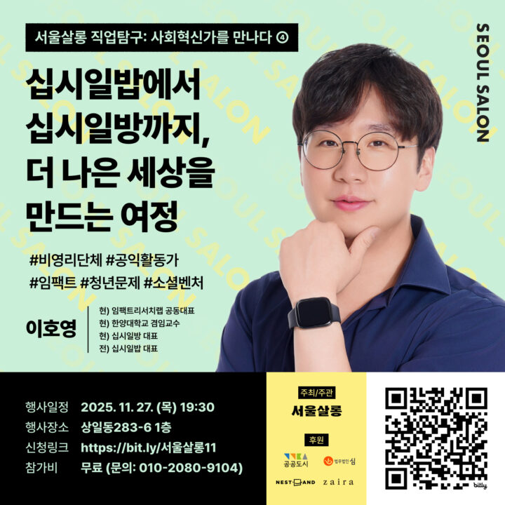 서울살롱이 오는 11월 27일 서울 강동구 상일동에서 ‘직업탐구 시리즈’ 네 번째 강연을 연다. 이번 강연의 연사는 청년 주도 사회혁신 모델을 개척해온 이호영 십시일방 대표로, 주제는 ‘십시일밥에서 십시일방까지, 더 나은 세상을 만드는 여정’이다.