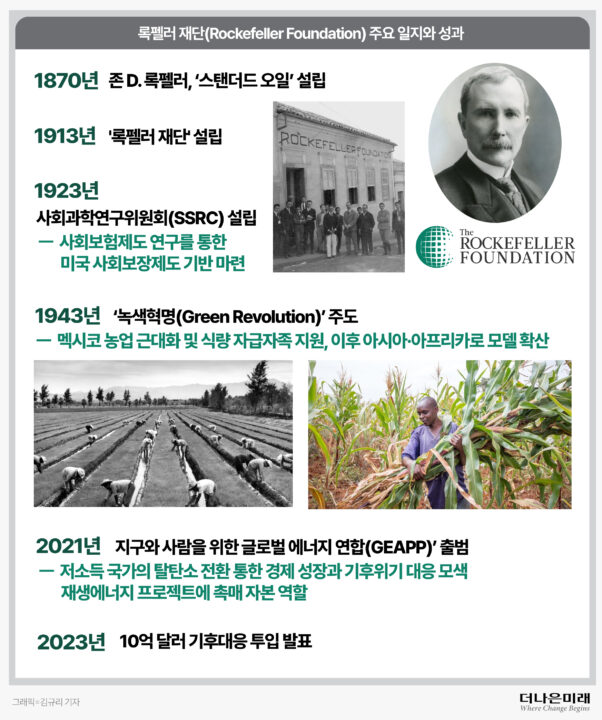 설립 110년을 맞은 지금, 록펠러 재단은 ‘기후 전환’을 새로운 미션으로 설정했다. 2023년 9월, 라지브 샤 대표는 유엔총회 기간 중 향후 5년간 10억 달러(한화 약 1조 4700억원)이상을 기후 대응에 투입하겠다고 발표했다. 핵심은 에너지·식량·건강·금융 등 4대 분야에 걸친 기후 문제를 통합하겠다는 것이다.