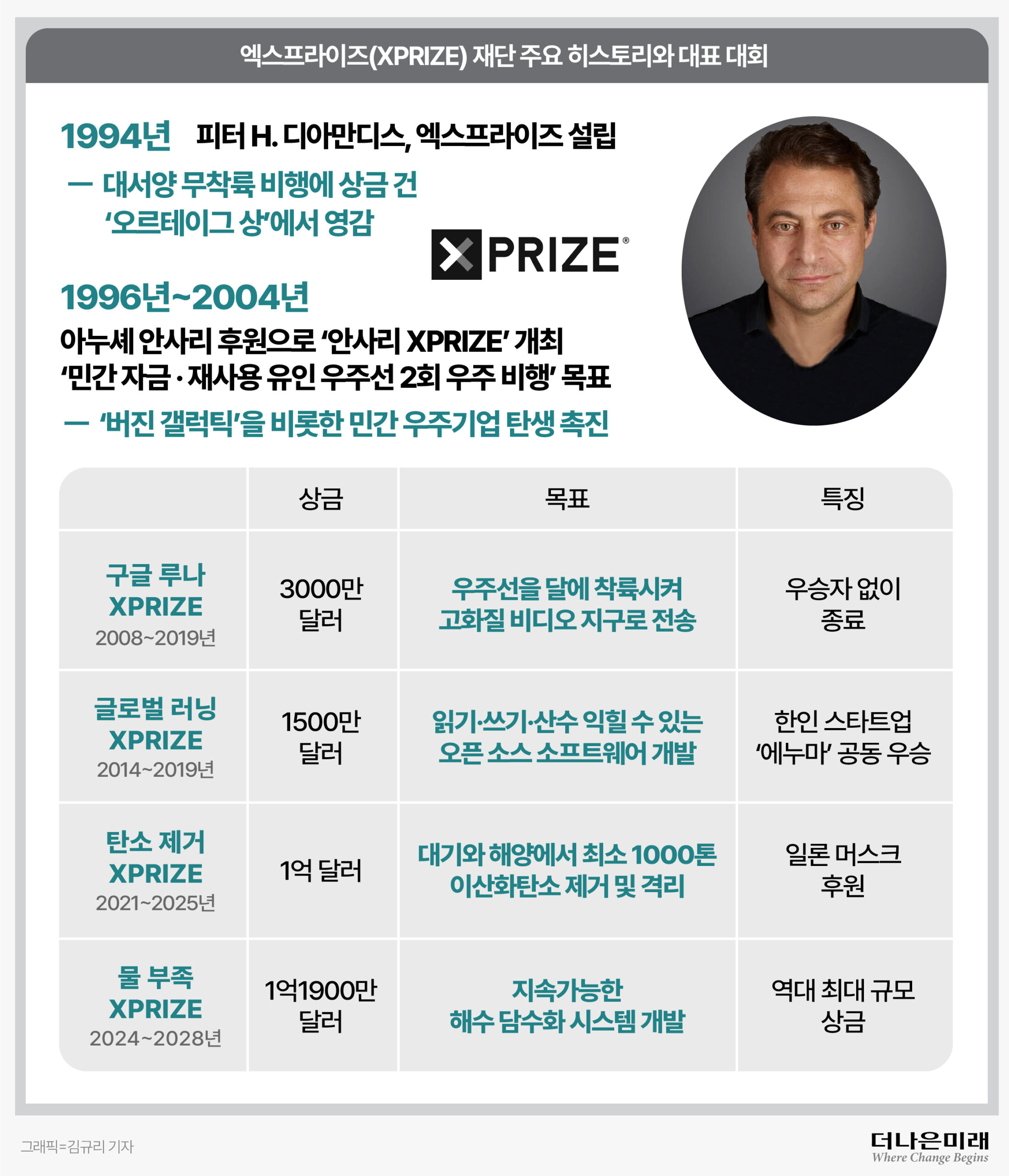 엑스프라이즈 재단은 1994년 미국에서 공식 출범했다. 창업자는 그리스계 미국인 공학자이자 의사인 피터 디아만디스(Peter H. Diamandis)다. 흥미로운 점은 출범 당시 디아만디스에게는 상금으로 줄 1000만 달러가 없었다는 사실이다. 거부(巨富)가 막대한 사재를 출연해 설립하는 일반적인 ‘사적 재단(Private Foundation)’과 달리, 엑스프라이즈는 아이디어 하나로 외부 후원자를 찾아 나서는 ‘공익 자선단체(Public Charity)’의 길을 택했다.