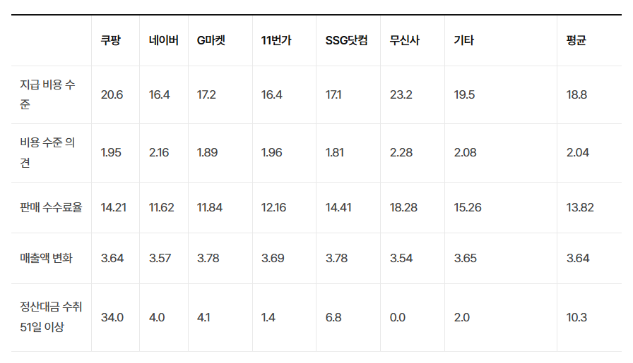 비용 항목별로는 판매수수료가 50%로 가장 컸고, 물류비(29.0%)와 광고비(19.8%)가 뒤를 이었다. 쿠팡의 중개 거래 판매수수료율 역시 14.21%로, 전체 평균(13.82%)보다 높았다.