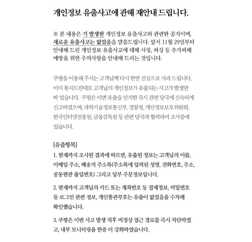 반면 쿠팡은 상황 파악조차 늦었다. 첫 해킹 시점으로 추정되는 6월 이후 약 5개월 동안 유출이 이어졌는데도, 회사가 문제를 인지한 것은 고객 민원이 접수된 11월 6일이었다. 내부 확인을 거쳐 대규모 유출을 인정한 것은 11월 18일. 이후 다시 12일이 지나서야 박대준 대표가 사과문을 냈지만, 구체적인 보상안은 없었다.. “수사와 관계부처 조사 결과를 봐야 한다”는 이유에서다.