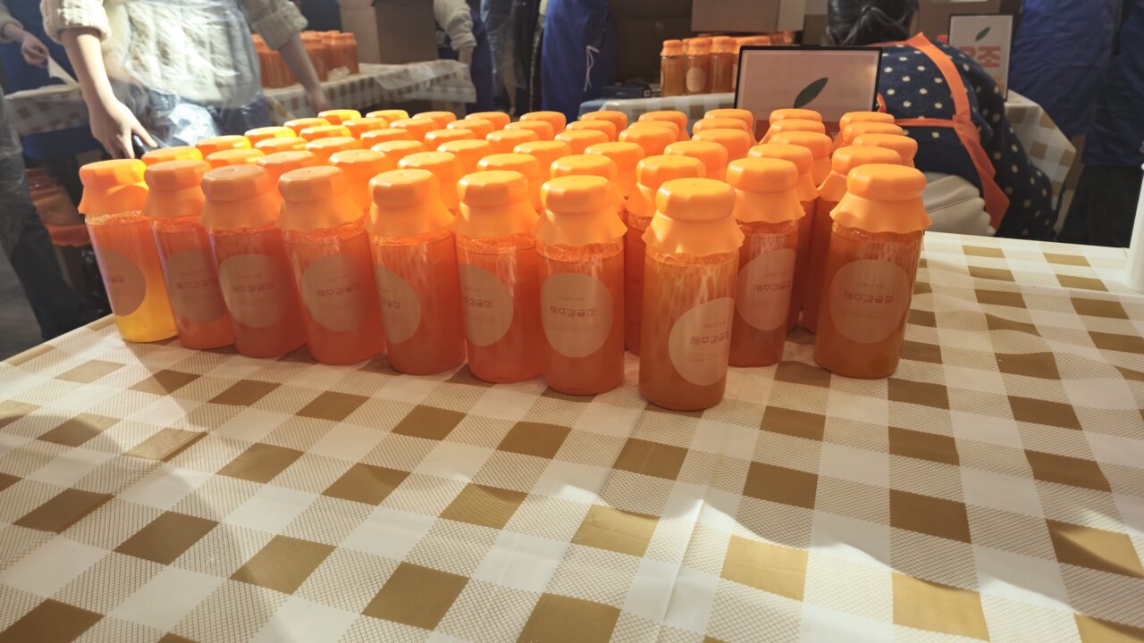 난관은 귤청을 병에 ‘적당한 양’으로 나눠 담는 일이었다. 깔때기를 대고 끈적한 청을 흘리지 않게 담는 작업은 고도의 집중력을 요했다. 겉면에 묻은 설탕과 청을 닦고 병뚜껑을 닫은 뒤 ‘제주감귤청’ 스티커까지 붙이고 나니 제법 그럴싸한 판매용 제품 태가 났다. 우리 조에서만 50개가 넘는 귤청이 순식간에 완성됐다.