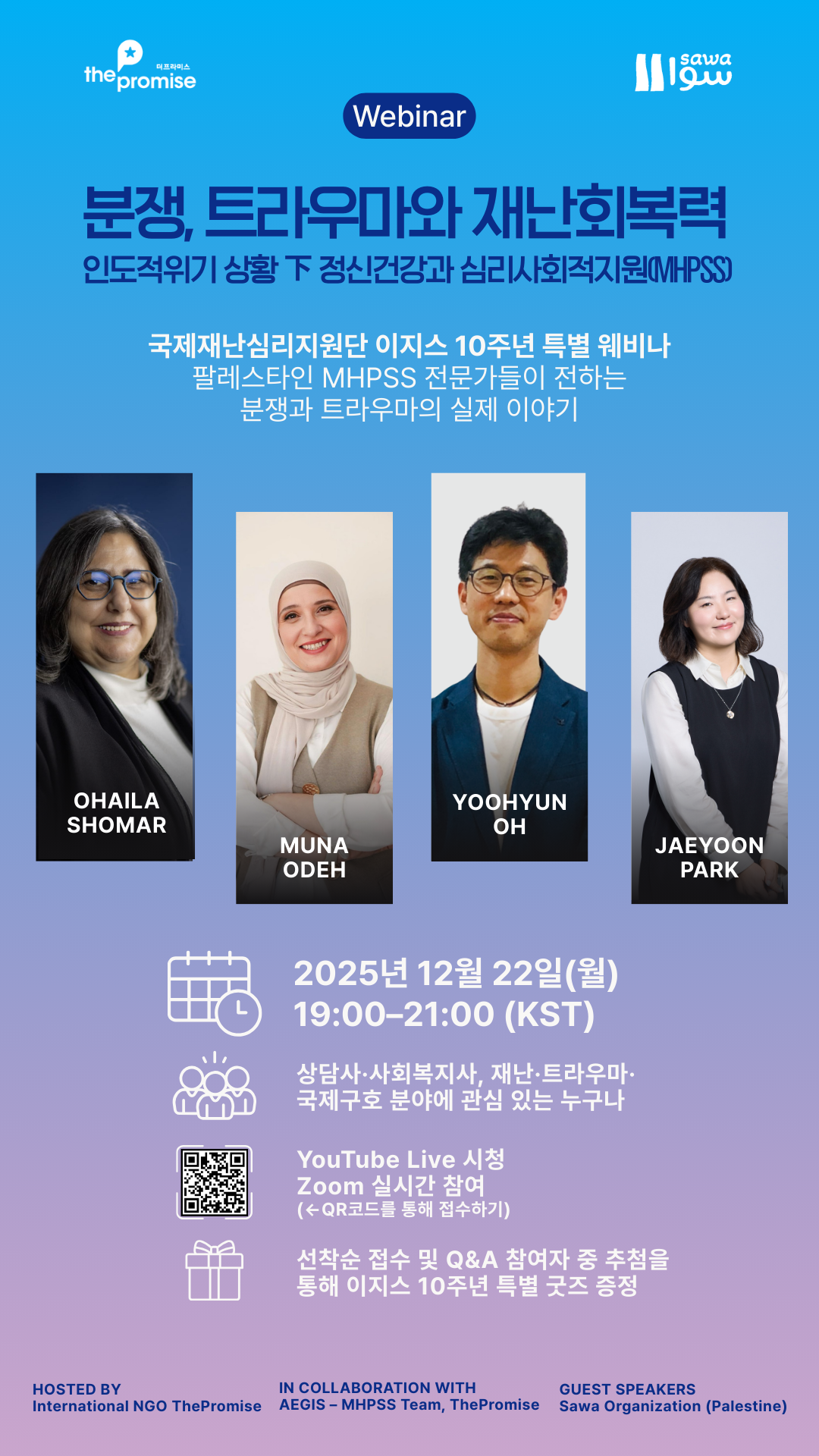 재난심리지원 NGO 더프라미스는 산하 국제재난심리지원단 이지스(AEGIS)가 창단 10주년을 맞아 오는 22일 오후 7시 국제 웨비나 ‘분쟁, 트라우마와 재난회복력: 인도적위기 상황 下 정신건강과 심리사회적지원(MHPSS)’을 개최한다.