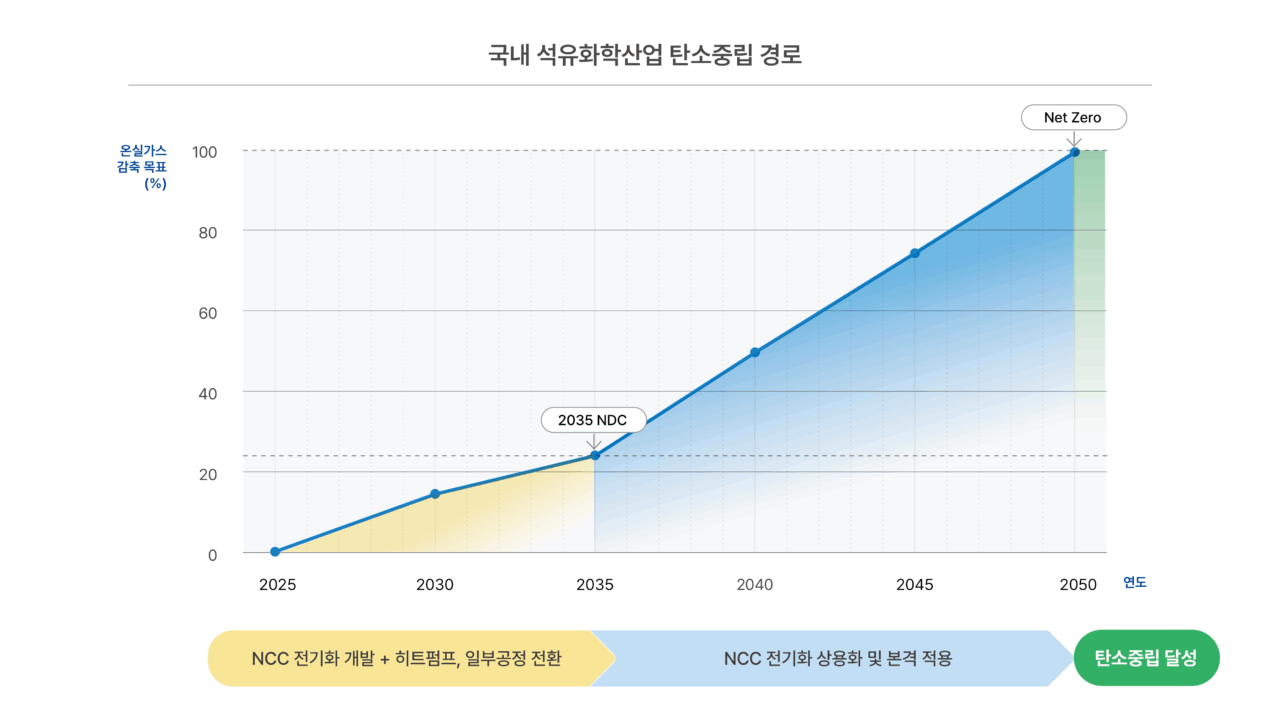 국내 석유화학 산업의 탄소중립 이행 경로에 따르면, 2035년 국가 온실가스 감축목표(NDC) 달성을 거쳐 나프타 분해 공정(NCC) 전기화가 상용화·확대되고, 이를 통해 2050년 탄소중립에 도달하는 시나리오가 제시됐다. /기후솔루션