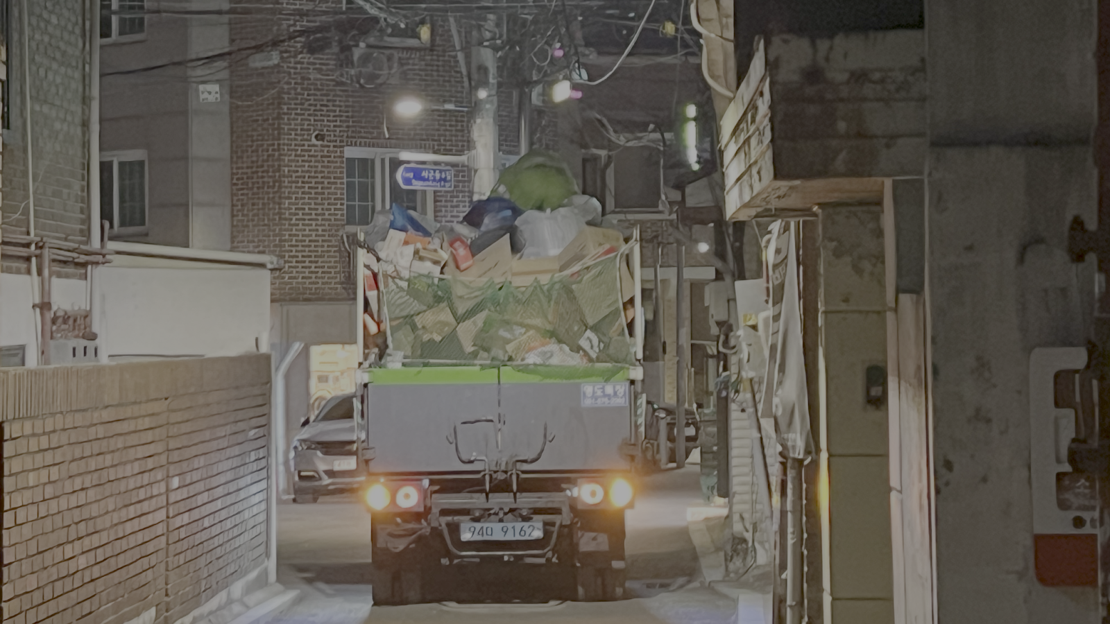 약 한 시간 반 뒤, 골목 안으로 수거 차량이 들어왔다. 두 명의 환경공무관이 차에서 내려 봉투를 집어 들었다. 습기를 머금은 봉투들은 거침없이 트럭 위로 던져졌다. 한 명이 봉투를 들어 올리면, 다른 한 명은 계단 세 단 높이의 적재함 위에 올라 ‘토스’하듯 받아 올렸다.