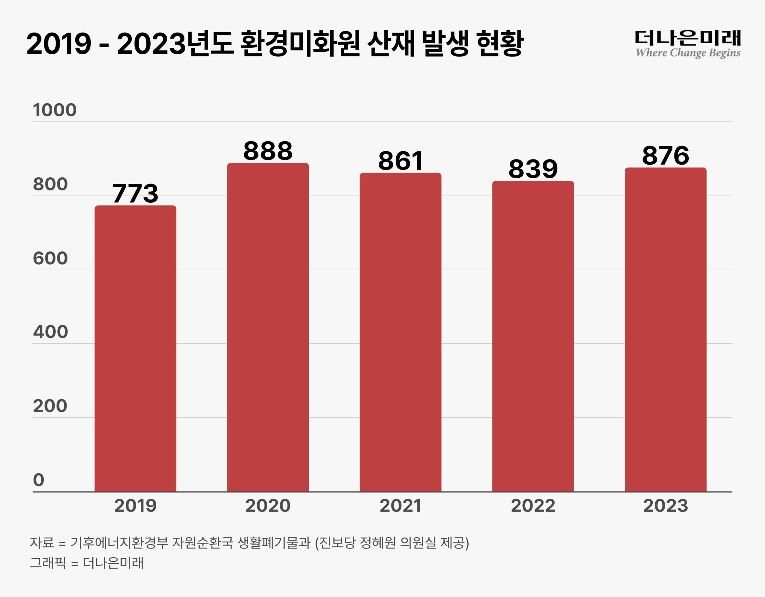 그러나 사고는 줄지 않았다. 2025년 9월 새벽, 서울 강서구 화곡동에서 생활폐기물을 수거하던 50대 환경공무관이 차량 후진 과정에서 전봇대와 차량 사이에 끼여 숨졌다. 박해철 더불어민주당 의원실이 근로복지공단으로부터 받은 자료에 따르면, 환경공무관 산재 피해자는 2020년 6354명에서 2024년 8446명으로 늘었다. 정혜경 진보당 의원실 자료에서도 안전사고는 2019년 773건에서 2023년 876건으로 증가했다.
