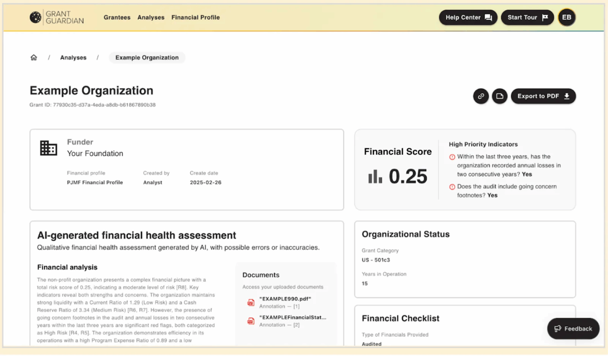 업무 효율화 분야에서 AI의 효과는 비교적 분명하다. 패트릭 J. 맥거번 재단은 올해 1월 재단과 비영리단체의 재무 검토 부담을 줄이는 AI 도구 ‘그랜트 가디언(Grant Guardian)’을 무료로 공개했다. 이 도구는 지원 단체의 재무 상태를 자동으로 분석해 재단에 요약 보고서를 제공한다. 비영리단체는 별도의 추가 입력 없이 기존 재무 문서만 제출하면 된다.