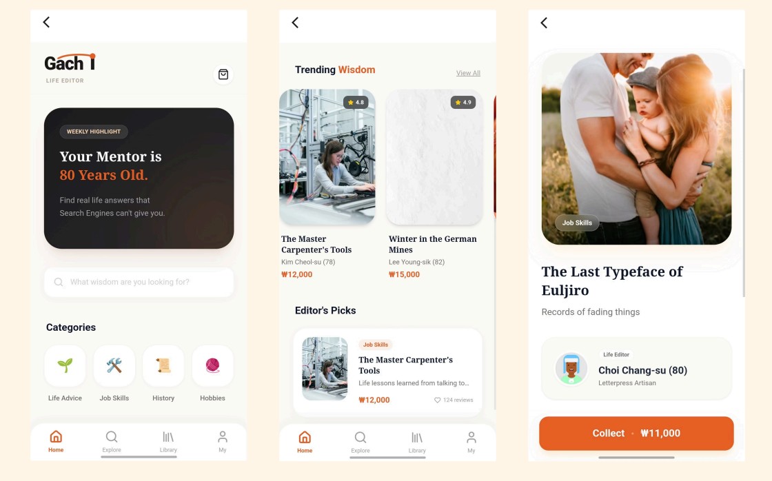 Gachi는 사용자가 하루 3~5분 정도 음성으로 추억과 경험을 말하면, AI가 이를 텍스트로 전환해 목차를 구성하고 자서전 형태로 완성하는 서비스다. AI는 서사가 비는 지점을 감지해 추가 질문을 던지며 보다 깊은 회상을 유도하기도 한다. 팀원 안상민 씨는 “자서전을 쓰며 삶을 회고하는 과정 자체가 임상적으로 강력한 항우울 효과를 낸다는 점을 참고했다”고 말했다.