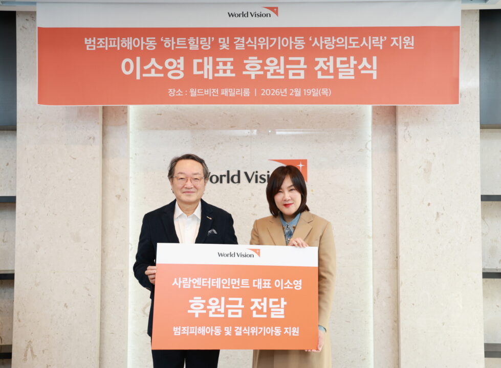 국제구호개발 NGO 월드비전이 이소영 사람엔터테인먼트 대표로부터 국내 취약아동을 위한 후원금을 전달받았다고 20일 전했다.