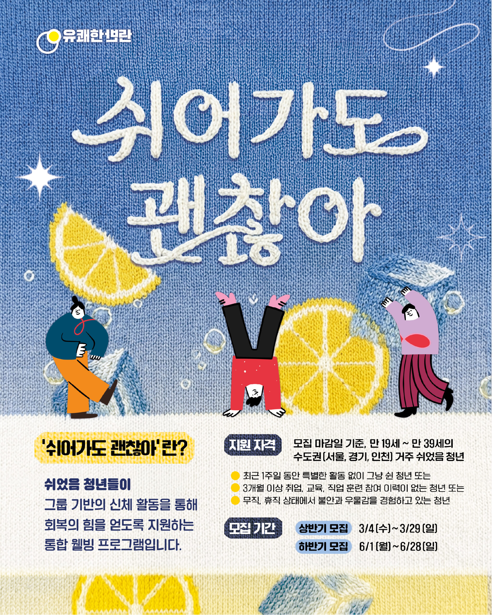 사단법인 유쾌한반란이 ‘쉬었음(NEET)’ 청년을 위한 회복 프로그램 ‘쉬어가도 괜찮아’ 상반기 참여자를 모집한다고 6일 전했다.