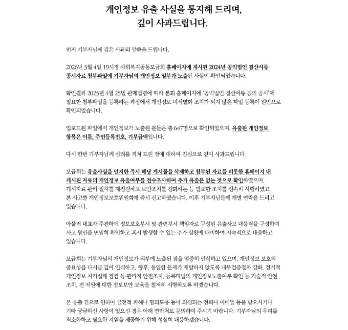 한편 정부는 행정안전부와 한국인터넷진흥원, 개인정보보호위원회 등을 중심으로 정확한 피해 규모와 유출 경위를 조사하고 있다. 정부 관계자는 “결산 공개 과정에서 발생한 오류로 고의성은 없는 것으로 보이지만, 국민 기부 분위기가 위축되지 않도록 정확한 경위를 조사할 것”이라고 말했다.