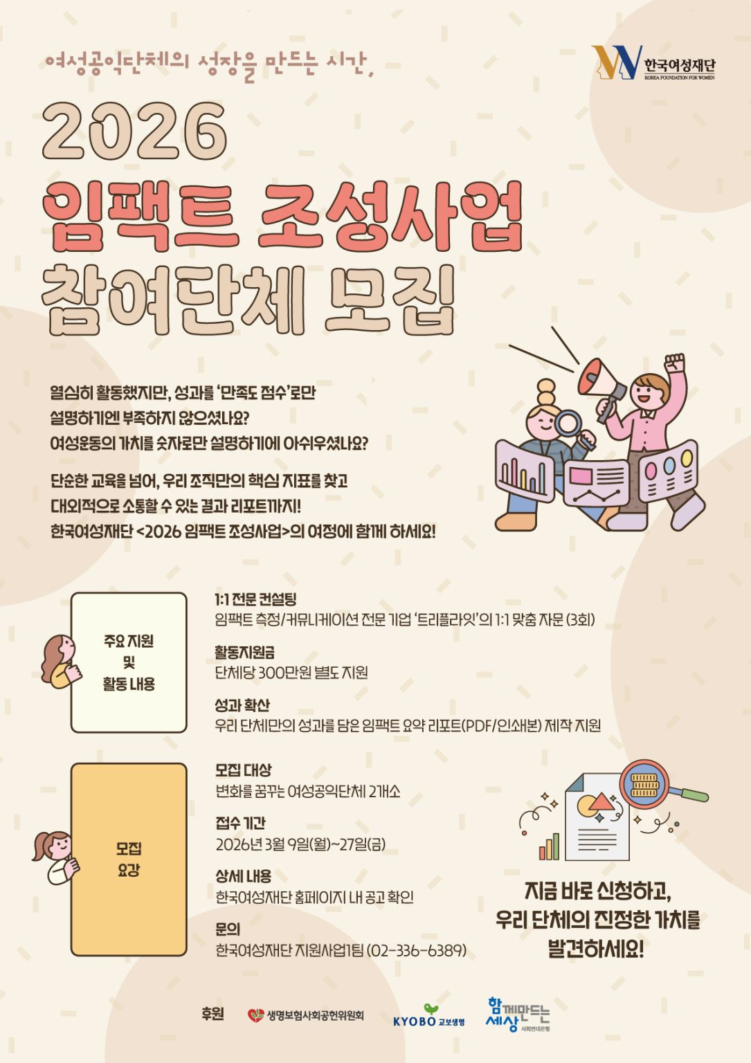 한국여성재단이 여성공익단체의 임팩트 측정 역량을 강화하기 위한 ‘2026 임팩트 조성사업’ 참여 단체를 모집한다고 밝혔다.