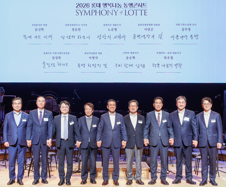 롯데가 지난 27일 롯데콘서트홀에서 파트너사 임직원을 초청해 ‘2026 롯데 행복나눔 동행콘서트’를 개최했다. 올해로 4번째를 맞이한 이번 동행콘서트에는 340여 개 파트너사 임직원 1300여 명이 참석했고, 롯데지주, 롯데백화점, 롯데GRS, 롯데건설 등 12개 계열사 임직원도 함께했다.