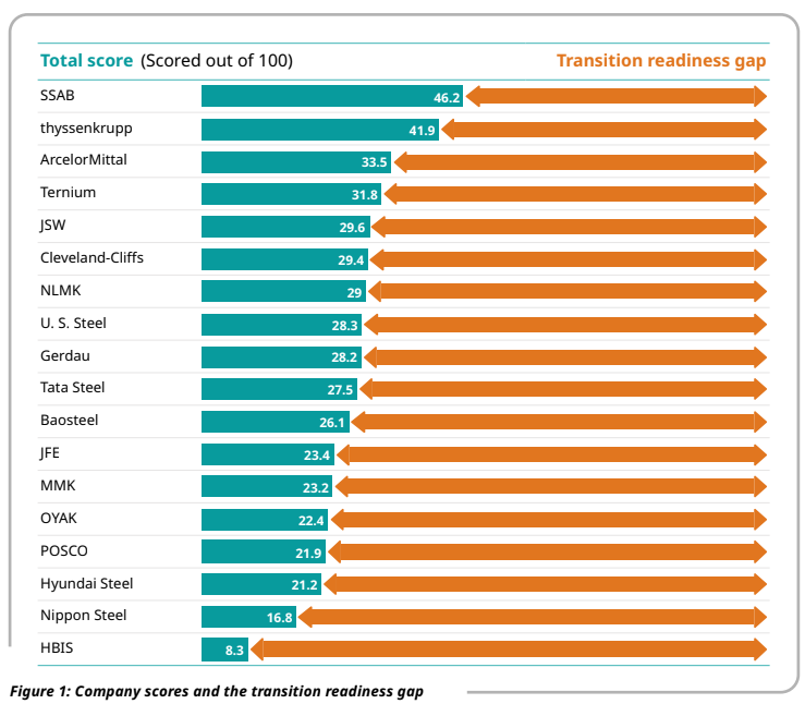이번 평가는 단순 배출량이 아니라, 기업이 석탄 기반 생산 구조를 줄이고 ‘탄소 배출이 거의 없는’ 생산 체제로 전환할 준비가 돼 있는지를 기준으로 진행됐다. 평가 대상 18개 기업 가운데 50점을 넘은 곳은 한 곳도 없었다. 녹색철강과 재생에너지 확대 관련 지표도 전반적으로 매우 낮은 수준에 머물렀다. 스틸워치는 기업들이 장기적인 기후 목표를 제시하고 있지만 실제 설비 전환과 투자는 이를 충분히 뒷받침하지 못한다고 봤다. 보고서는 이 같은 목표와 실행 사이의 간극을 ‘전환 준비도 격차’라고 설명했다.