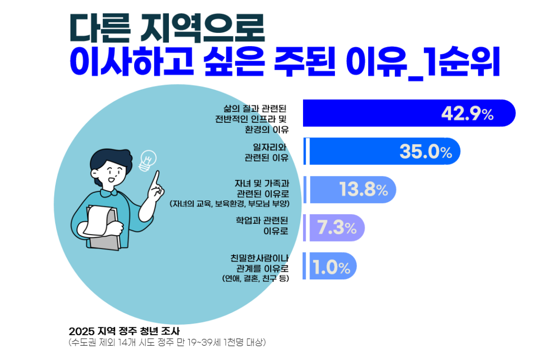청년재단이 2025년 지역 정주 청년 1000명을 대상으로 실시한 조사에 따르면, 타 지역 이주를 고려하는 주요 이유로 ‘삶의 질과 관련된 전반적 인프라 및 환경’이 가장 높게 나타났다. 또한 서울로 이주한 청년 1000명을 대상으로 한 조사에서는 59.8%가 출신 지역보다 서울 생활에 더 만족한다고 응답했다.