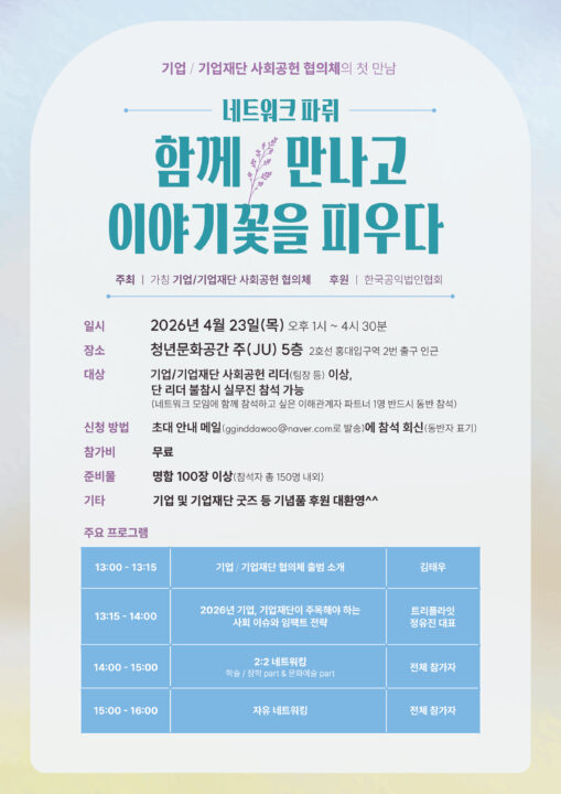가칭 ‘기업·기업재단 사회공헌 협의체’가 오는 4월 23일 서울 마포구 청년문화공간 주(JU)에서 네트워크 모임 ‘함께 만나고 이야기꽃을 피우다’를 개최한다. 이번 행사는 한국공익법인협회 후원으로 진행된다.