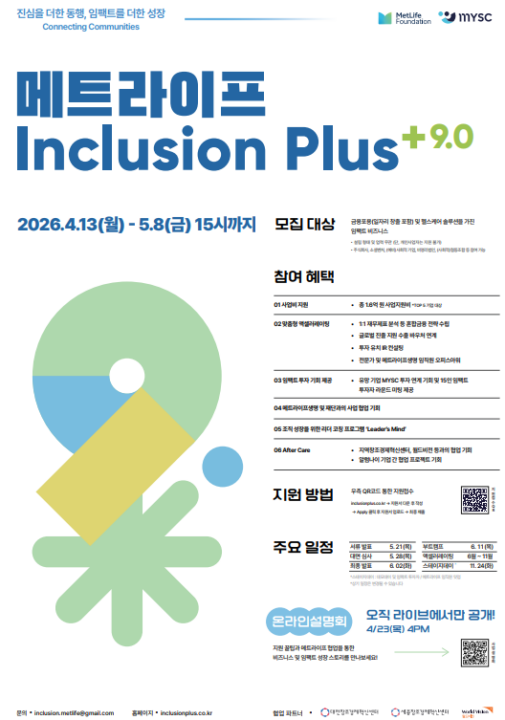 메트라이프생명 사회공헌재단(이사장 송영록)이 금융 포용 및 포용적 헬스케어 분야에서 사회혁신기업을 발굴 및 육성하기 위한 ‘메트라이프 인클루전 플러스 9.0(Inclusion Plus 9.0)’ 참여 기업을 모집한다.