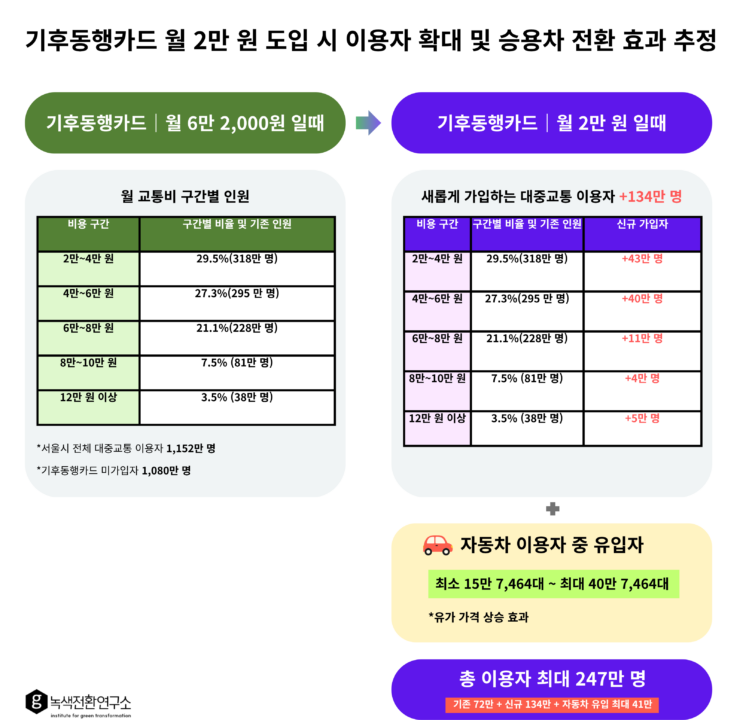 녹색전환연구소는 기후동행카드 요금을 월 2만 원 이하로 낮출 경우 신규 이용자가 늘고, 이에 따라 승용차 이용 감소와 온실가스 감축 효과가 나타날 것으로 분석했다. /녹색전환연구소