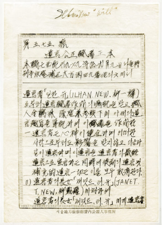 “손녀 유일링에게 대학 학자금 1만 달러를 준다. 딸 유재라에게 유한공고 안의 내 묘소와 주변 땅 5000평을 물려주니, 유한동산으로 꾸며 학생들이 마음대로 놀게 하라. 유한양행 주식 14만 여주는 전부 유한재단에 기증한다. 아들 유일선은 대학까지 졸업시켰으니 자립해서 살아라.” -유일한 박사의 유언장 中