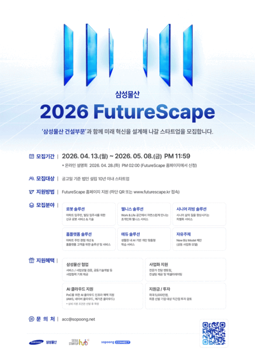 스타트업 밸류업 전문 액셀러레이터 소풍커넥트(대표 최경희)는 삼성물산 건설부문의 오픈이노베이션 프로그램 ‘2026 FutureScape’ 참가 스타트업을 모집한다고 밝혔다.