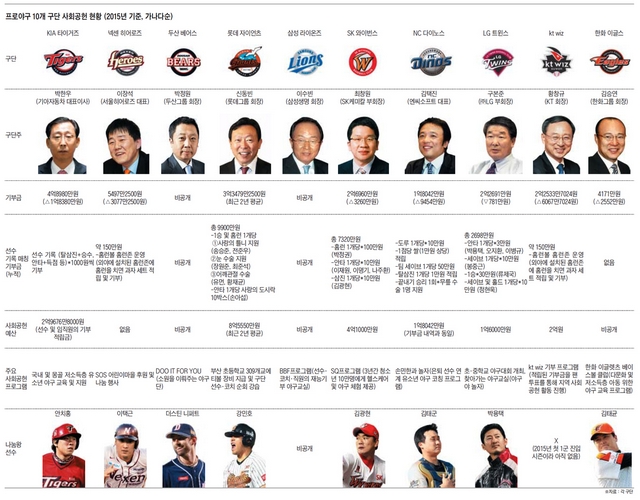 2015년 기준 기부금 규모는 기아타이거즈가 4억8980만원으로 가장 많았다. 롯데 자이언츠(3억3479만원·최근 2년 평균), SK 와이번스(2억6960만원), LG 트윈스(2억2691만원), kt wiz(2억2534만원)가 뒤를 이었다. 재계 11위 그룹인 한화가 운영하는 한화 이글스(4171만원)는 NC 다이노스(1억8042만원·시가총액 47위 엔씨소프트 운영), 넥센 히어로즈(5497만원)보다 기부에 인색했다.