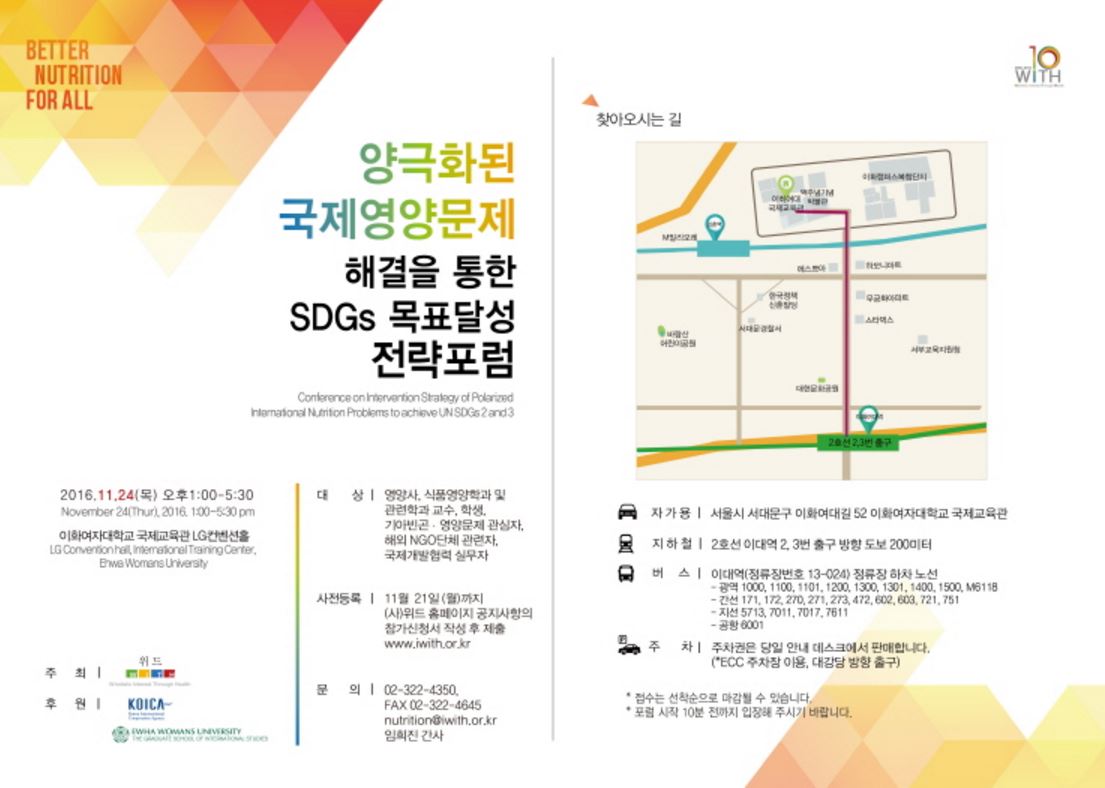 오는 11월 24일, 국제영양전문 NGO 위드에서 ‘양극화된 국제영양문제 해결을 통한 SDGs 목표달성 전략포럼’을 개최한다. 몽골·탄자니아·캄보디아·북한 등 11개 국가를 대상으로 국제영양구호 및 식생활 영양개선 활동을 해 온 위드의 창립 10주년을 맞이하여 개최하는 이번 행사에서는 영양결핍과 영양과잉이 공존하는 국제사회 영양문제의 양극화를 해결하기 위한 대응전략과 사례를 공유할 예정이다.
