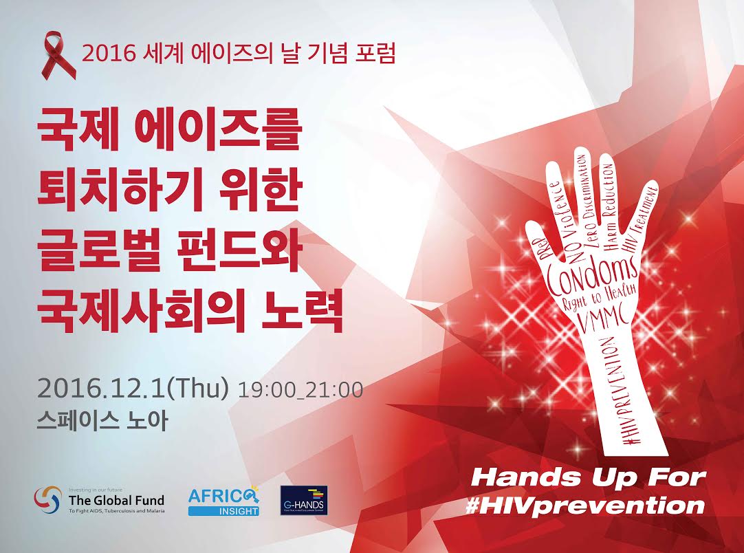 1일 저녁 7시부터 9시까지, 글로벌 펀드(The Global Fund to fight AIDS)는 ‘스페이스 노아(서울 중구 세종대로16길 23)’에서 ‘세계 에이즈의 날(12월 1일)’을 맞아 에이즈의 심각성을 알리고, 한국 정부의 에이즈에 대한 국제적인 참여를 촉구하기 위한 간담회를 개최한다. 글로벌 펀드는 지난 2002년 설립된 전세계 3대 질병인 에이즈, 결핵, 말라리아의 예방과 치료를 위해 자금을 유치하고 지원하는 민관 협력 시스템으로, 각국마다 파트너 기관들과 협력하는 방식으로 일하고 있다. 2016년 현재 전체 자금의 93.5%가 정부지원금이고 나머지 6.5%는 빌 앤 멜린다 게이츠 재단 등 기업 및 민간단체 등의 지원금이다. 이 자금으로 2012년 기준으로 국제 에이즈 자금의 20%, 결핵은 75%, 말라리아 자금의 67%를 지원했다. 글로벌 펀드를 통하여 2015 년까지 2000만 명 이상이 새 생명을 얻었다.