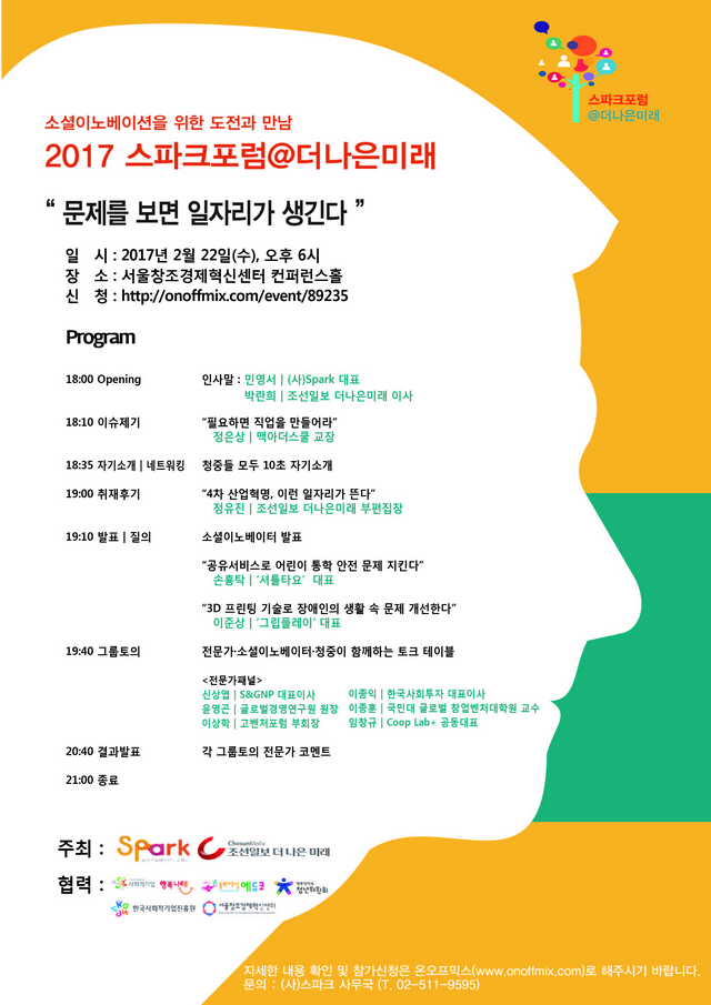 더나은미래와 ㈔스파크가 “4차 산업혁명 시대, 사회문제를 보면 일자리가 생긴다”를 주제로 ‘스파크포럼@더나은미래’를 개최합니다. 아이패드 화가, 모바일 요리사, 유머 작가 등 세상에 없는 직업을 만들어내는 ‘창직 카운슬러’ 정은상 맥아더스쿨 교장(인터뷰 기사보기)이 “필요하면 일자리를 만들어라”란 주제로 특강을 엽니다. 이후 혁신적인 아이디어와 기업가 정신으로 사회문제 해결과 비즈니스, 두 마리 토끼를 잡은 ‘소셜 이노베이터(Social Innovator)’ 두 명을 초대해 성공 노하우를 듣고, 전문가 및 대중이 함께하는 토크 테이블이 진행됩니다. 이번 포럼에 연사로 참여하는 소셜이노베이터는 공유 서비스로 어린이 통학 안전을 지키는 ‘셔틀타요’의 손홍탁 대표(인터뷰 기사보기), 3D 프린팅 기술로 장애인의 생활 속 문제를 해결하는 ‘그립플레이’의 이준상 대표(인터뷰 기사보기)입니다. 사회문제 해결과 혁신적인 비즈니스 모델에 관심이 있는 여러분의 많은 참여 바랍니다.