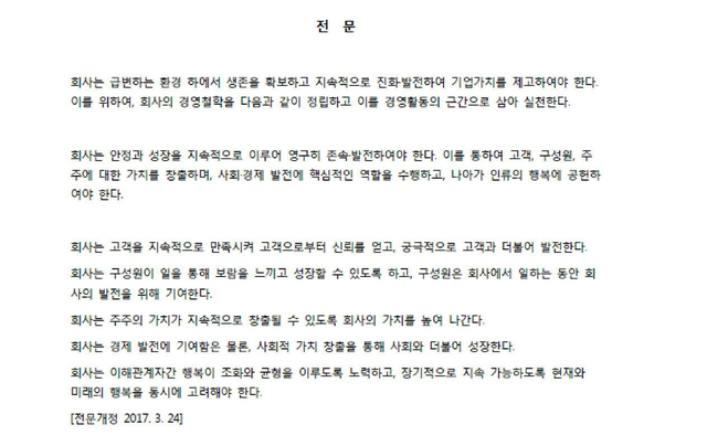 한편, SK는 지난달 24일 ‘사회적 책임’을 담은 기업 정관을 변경했다. 기업이 영리만을 추구하는 것이 아닌, 사회적 가치까지 고려해야한다는 점을 목적화한 것. 수정된 정관에는 ‘회사는 이해관계자간 행복이 조화와 균형을 이루도록 노력하고, 장기적으로 지속 가능하도록 현재와 미래의 행복을 동시에 고려해야 한다’, ‘회사는 경제 발전에 기여함을 물론, 사회적 가치 창출을 통해 사회와 더불어 성장한다’ 등의 내용이 추가했다.