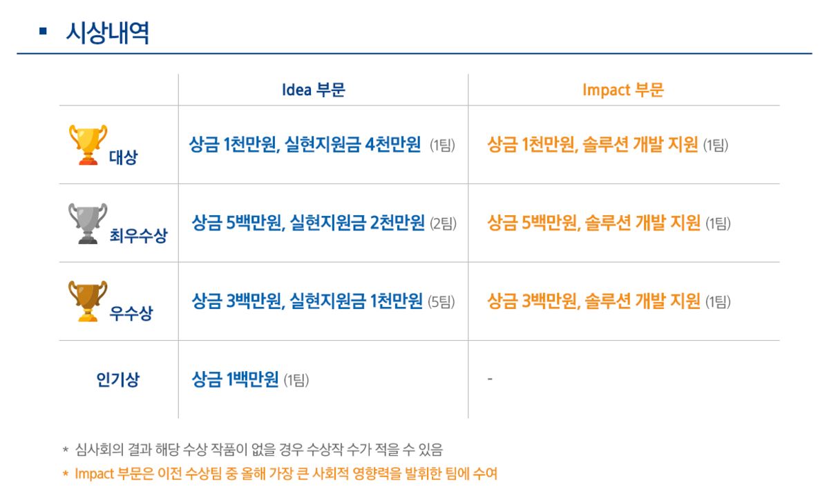 올해 공모 분야는 교육, 건강·의료, 환경·안전, 지역 사회, 지구온난화 등 5개로 ‘지구온난화’ 분야가 신설됐다. 참가를 원하는 사람은 5월 25일(목) 저녁 6시까지 홈페이지를 통해 접수하면 된다. 이후 6월 8일 예선에 통과한 팀을 발표하며, 7월 7일 본선에 진출하는 20팀을 선발한다.