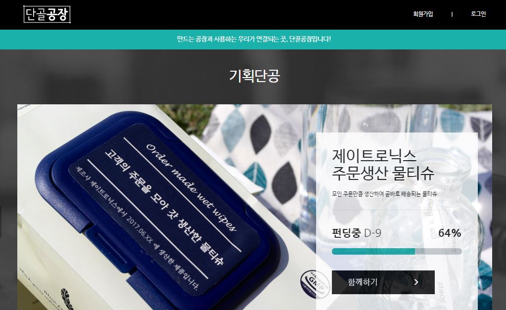 사이트 오픈 후 첫 기획단공으로는 제이트로닉스의 주문생산 물티슈가 선정됐다. 이정호 제이트로닉스 대표는 유통업에 종사하다가 스스로 납득할 수 있는 수준의 제품을 만들고 싶다는 생각에 제조업에 뛰어들었다고 한다. 이참 대표는 “물티슈는 실생활에서 자주 사용하고, 민감한 제품인만큼 제조사의 이야기가 소비자의 입장에서 중요할 것이라 판단했다”고 선정 취지를 전했다. 홈페이지에는 물티슈 생산 과정에서 사용되는 원료와 주요 공정이 자세히 설명돼있다. 6월 24일까지 진행되는 펀딩에 5000개 주문생산량 중 3760개가 선주문됐다(6월 19일 기준). ☞단골공장 물티슈 펀딩 참여하기