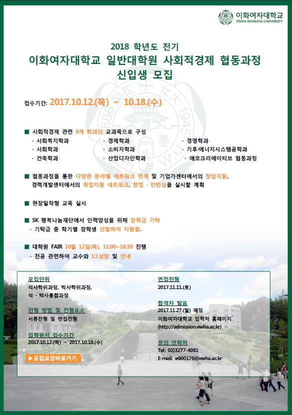 이화여대가 2018년 전기 사회적경제 협동과정 석·박사 과정의 신입생을 모집한다.