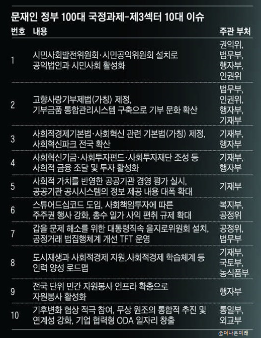 ∗더나은미래는 문재인 정부 100대 국정과제 중 제3섹터 10대 이슈를 연말까지 기획연재합니다. 다음호에는 기업의 사회적책임(CSR)과 사회적 가치 평가 이슈를 다룹니다.