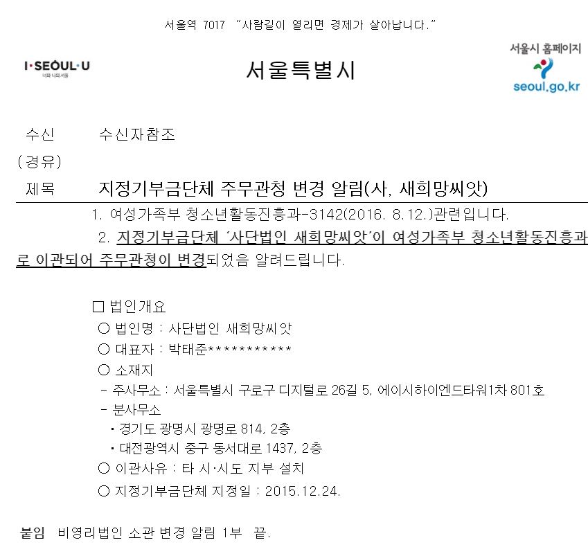 2015년 12월 24일, 새희망씨앗은 비영리 사단법인에서 지정기부금 단체로 한 단계 업그레이드된다. 당시 주무 관청인 서울시가 서류 심사를 거쳐 기획재정부 법인세과에 추천했고, 기획재정부에서 심사를 통해 지정기부금 단체를 지정했다. 지정기부금 단체가 되면 기부금 영수증을 발행할 수 있고, 기부자들은 기부금에 대한 세제 혜택을 받을 수 있다. 단체의 ‘공익성’이 인정된다는 의미에서 부여되는 인센티브다. 새희망씨앗은 지정기부금 단체가 되면서 전국으로 활동 범위를 넓혀나갔다. 경기도 광명시와 대전에 지부 설치를 이유로 2016년 4월 주무 관청을 서울시에서 여성가족부로 이관할 것을 요청했다. 이후 한 차례 현장 점검을 한 뒤 2016년 8월 새희망씨앗의 주무 관청은 여성가족부로 이관됐다.
