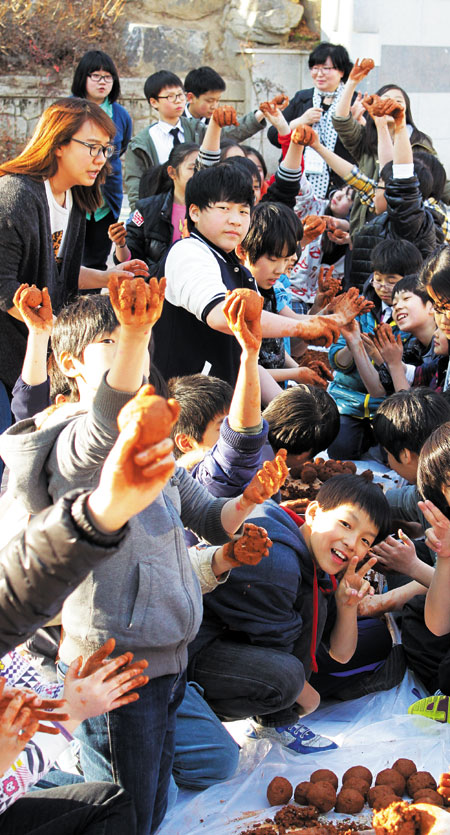 노원청소년수련관에서 진행하는 3-벨트 프로젝트에 참여한 지역의 초·중학생들이 자신들이 만든 흙공을 들어보이고 있다.